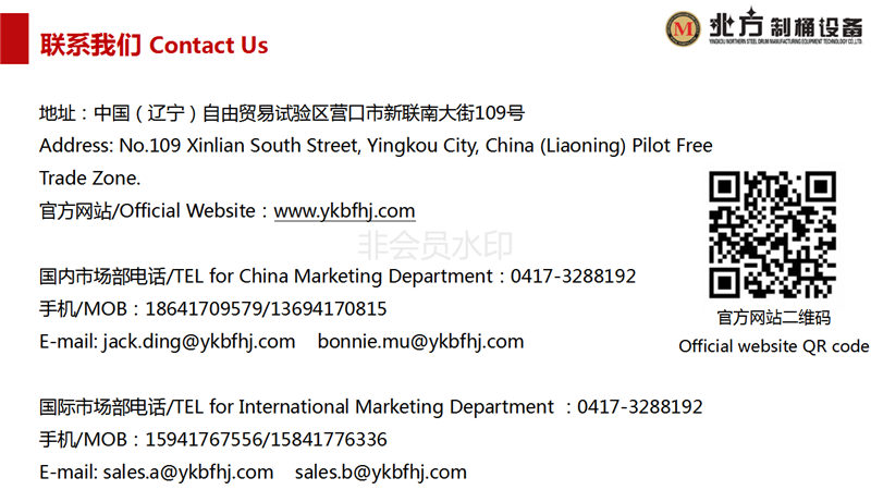 主辦單位:營口北方制桶設備科技有限公司 市場部電話:0417-3288192 備件銷售熱線:0417-3288192 售后服務熱線:0417-3288153